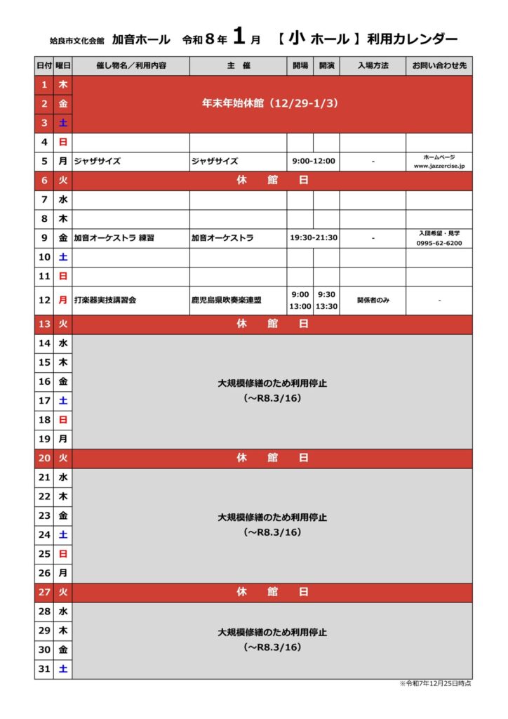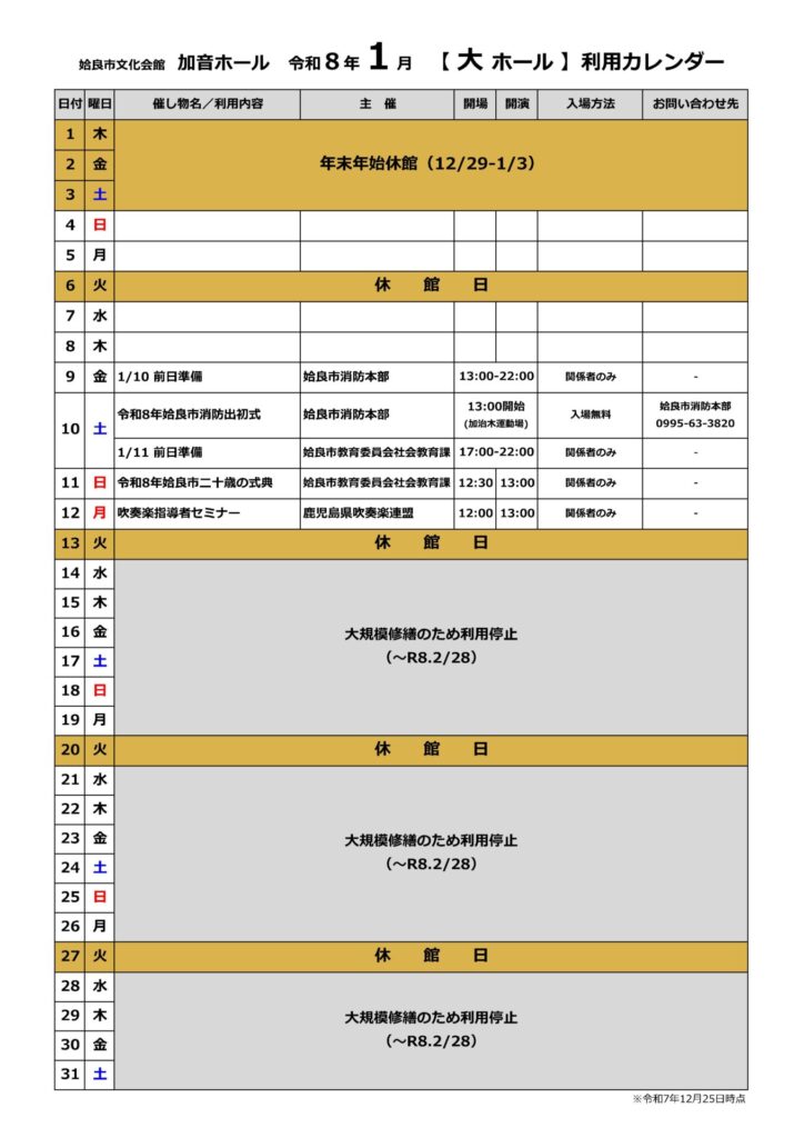 加音ホール2026年1月ホール利用カレンダー