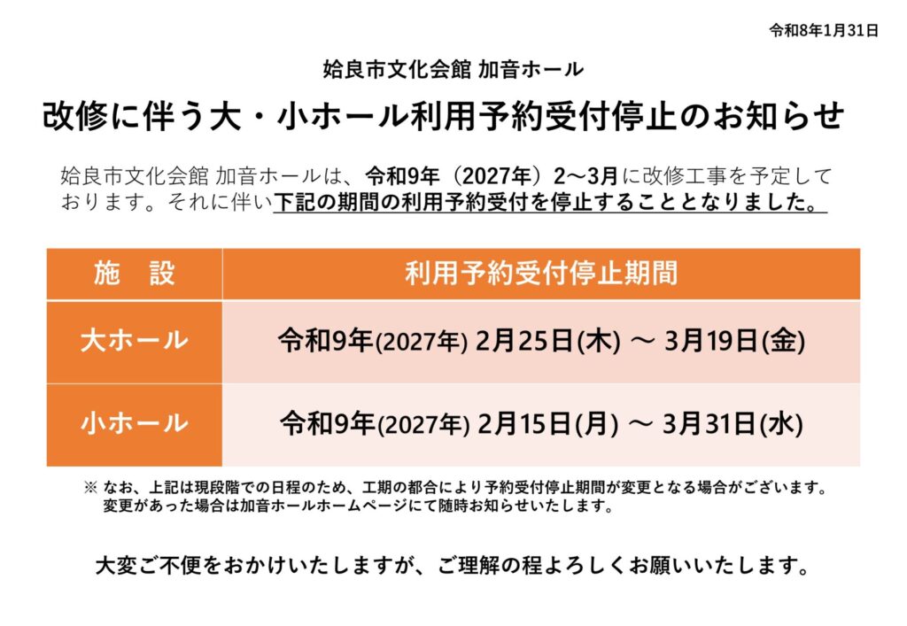 姶良市文化会館 加音ホールは、令和9年(2027年)2~3月に改修工事を予定しております。