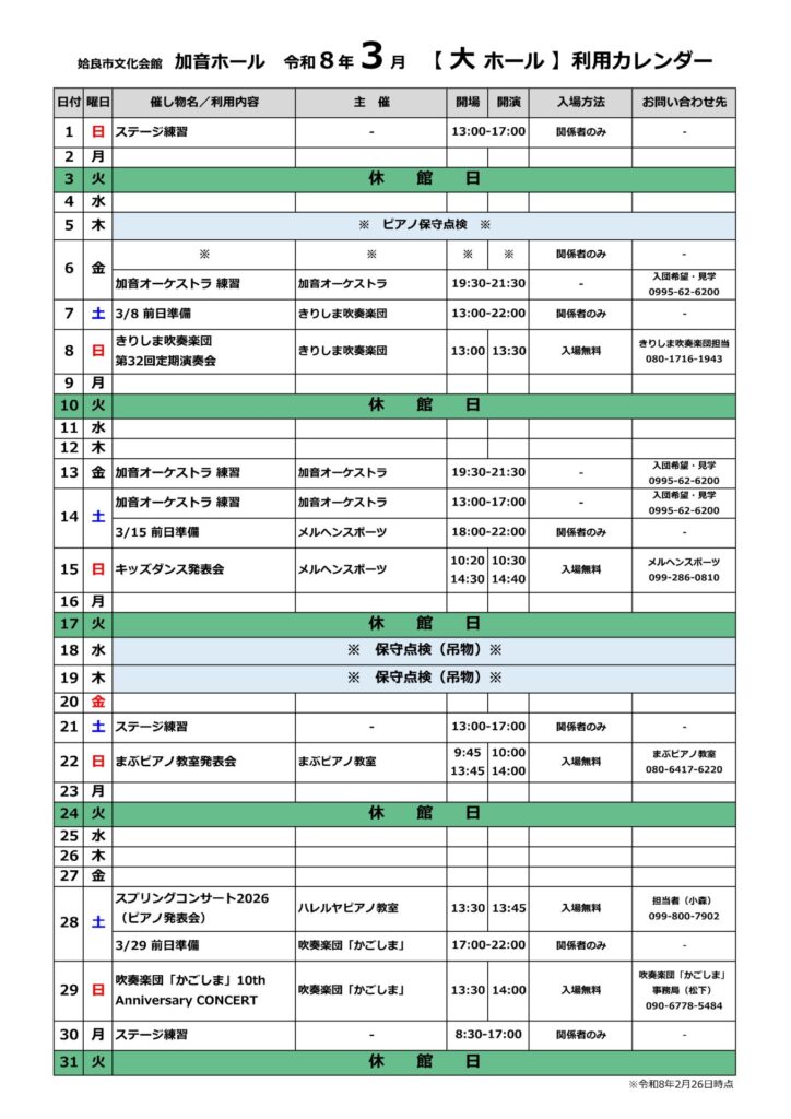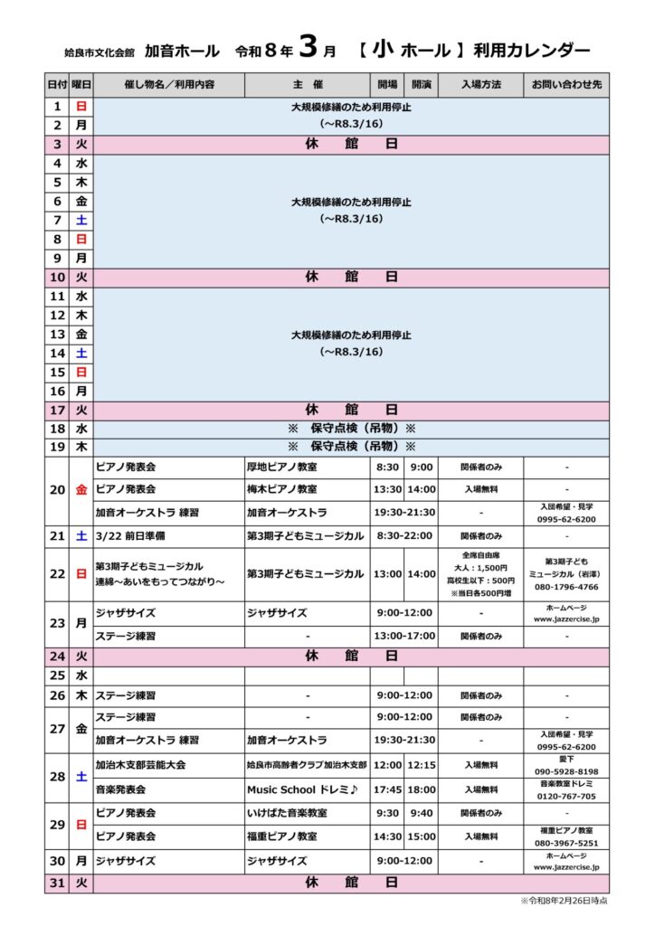 加音ホール2026年3月ホール利用カレンダー